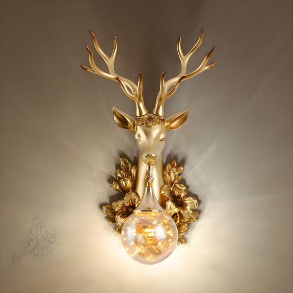 Luxe Gold Deer Head Wall Sconce, Resin Animal Lamp with LED Glass Globe for Bedroom Hallway - 110V-120V 12.5" Deer