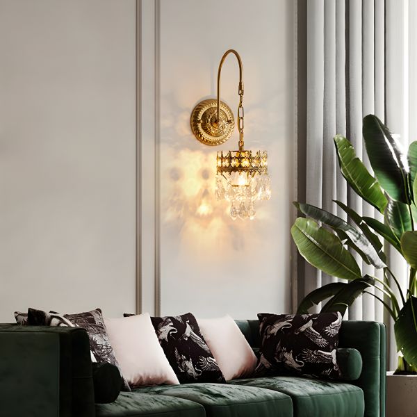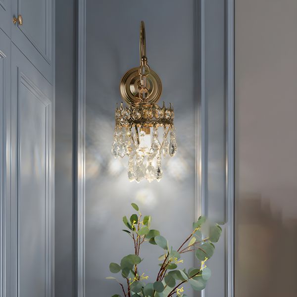 French Country Crystal Wall Sconce, Gold Vanity Light Fixture with Crown Shade for Bedroom Hallway - 110V-120V