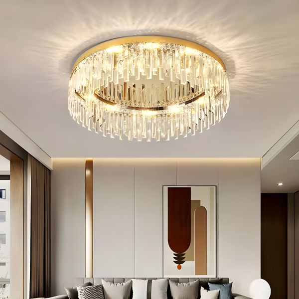 Glam K9 Crystal Flush Mount Ceiling Light, Round Stainless Steel Fixture with Refractive Prisms - Gold 110V-120V 18" Warm Light