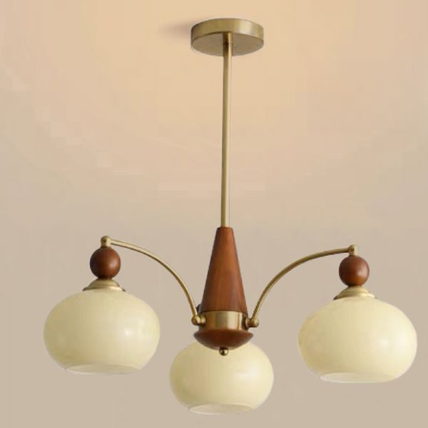 Mid-Century Walnut and Brass Chandelier, Glass Globe Ceiling Light Fixture for Dining Room - 3 110V-120V Ivory