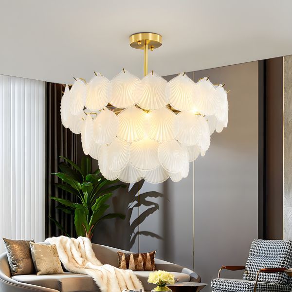 Art Deco Scallop Glass Chandelier, Gold Semi Flush Mount Ceiling Light for Dining Room - Medium 3 Tiers Frosted Glass 110V-120V