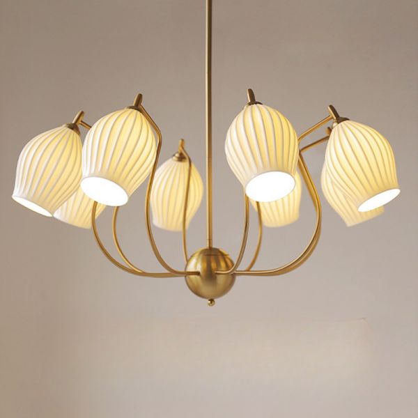 Mid-Century Tulip Chandelier, Ribbed White Glass Pendant Light for Dining & Living Room - Gold 110V-120V 8