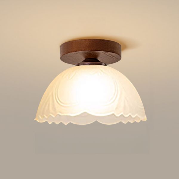 Japandi Solid Wood Flush Mount Ceiling Light, Textured Glass Shade Fixture for Hallway and Bedroom - 110V-120V Dome