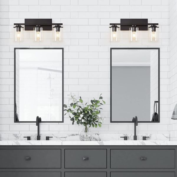 Modern Industrial 3-Light Mirror Front Light, Metal Wall Sconce with Clear Glass Shades for Bathroom - Black 110V-120V
