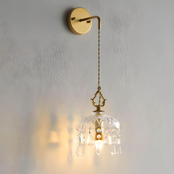 French Country Wall Sconce Lighting, Vintage Brass Finish with Textured Glass and Crystal Drop Shade - 110V-120V No Switch Gold 6"