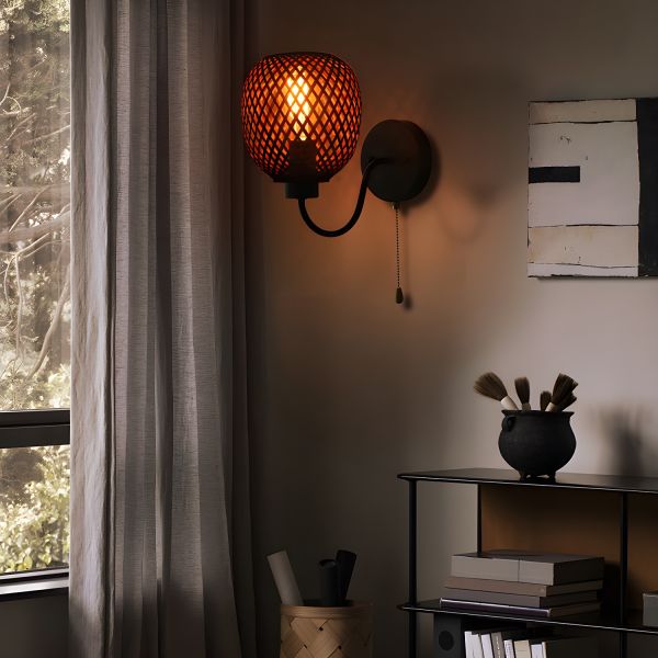 Bohemian Woven Bamboo Wall Sconce, Rustic Lattice Shade with Pull Chain Switch - 110V-120V Walnut