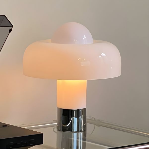 Mid-Century Glass Mushroom Table Lamp, Retro Bedside Nightstand Light with Chrome Base - White 110V-120V