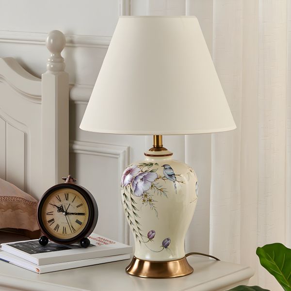 Vintage Floral Ceramic Table Lamp, Porcelain Bird Base with Fabric Shade for Living Room - 110V-120V