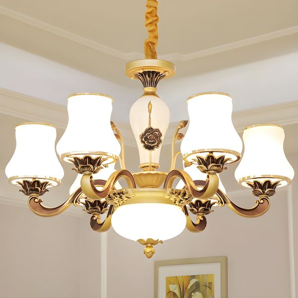 Grand Traditional Gold Chandelier, Multi-Tiered High Ceiling Pendant Light with Frosted Glass Shades - 110V-120V 7