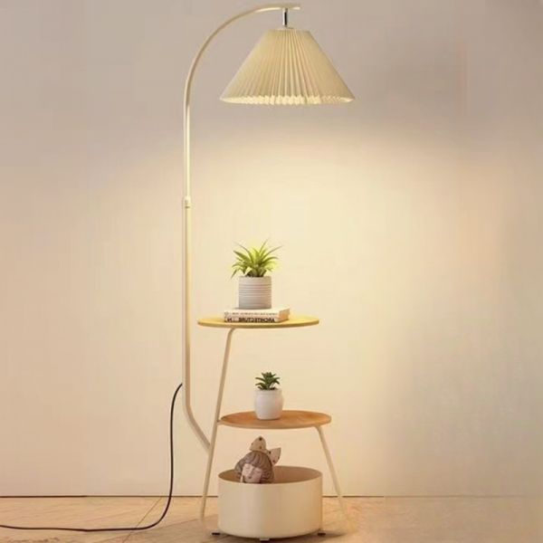 Retro Arched Floor Lamp with Integrated Tray Table, Adjustable Reading Light with Pleated Shade - Fabric 110V-120V