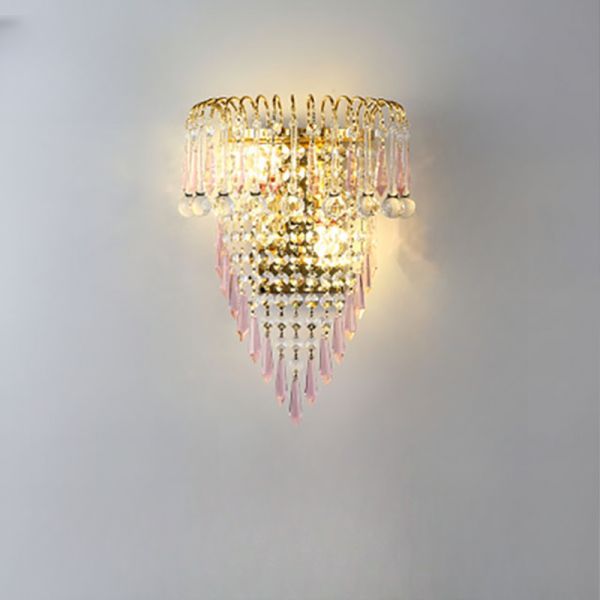 Art Deco Tiered Crystal Wall Sconce with Gold Finish and Teardrop Pendants - Pink 110V-120V