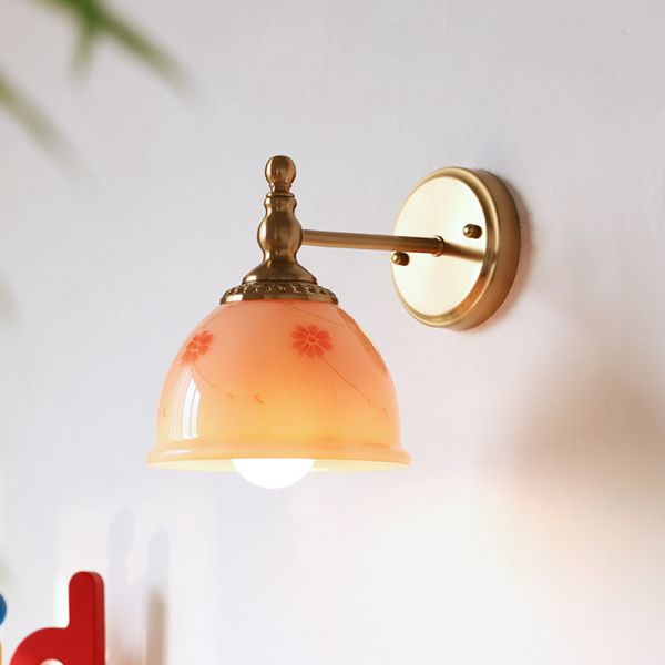 Vintage French Country Wall Sconce, Brass Finish with Pink Floral Glass Shade for Bedroom - 110V-120V