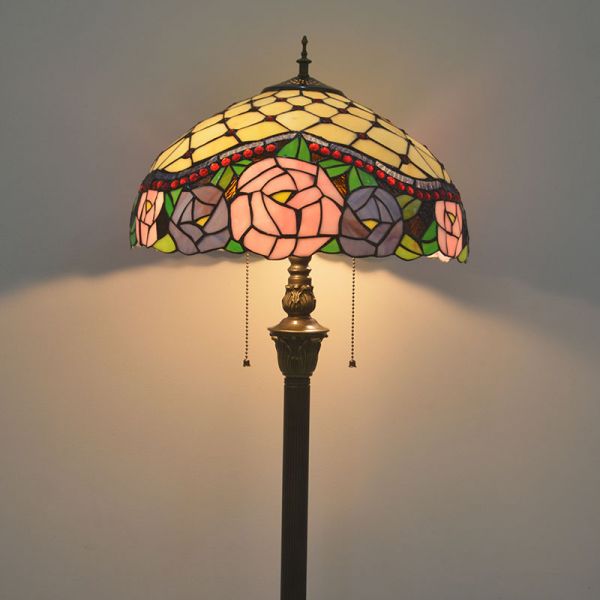 Vintage Tiffany-Style Stained Glass Floor Lamp with Dual Pull Chains and Antique Bronze Base - 110V-120V Pinkish Red