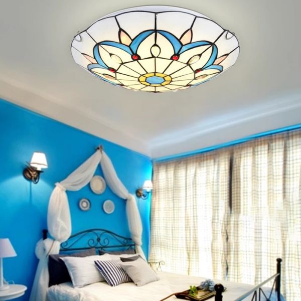 Multicolored Glass Tiffany Ceiling Flush Mount Lights Domed Flush Mount Fixture for Living Room - White/Blue 110V-120V 20"