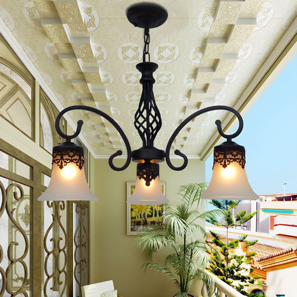 Rustic Vintage Black Iron Chandelier with Ornate Gold-Rimmed Glass Shades - 110V-120V Black 3