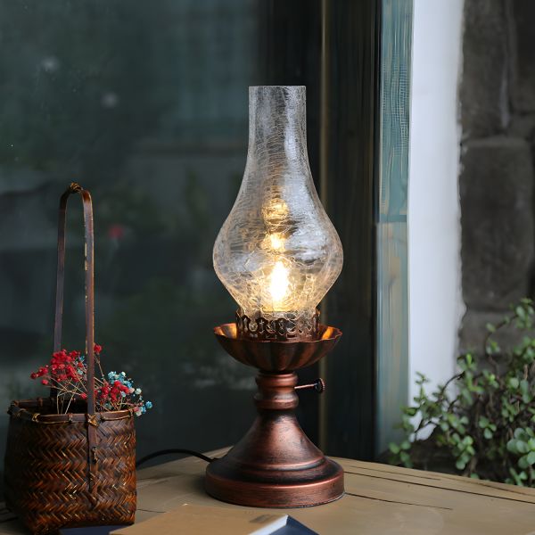 Rustic Vintage Hurricane Table Lamp with Crackle Glass Shade & Dimmer Switch - 110V-120V Bronze A