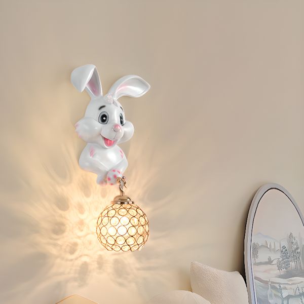 Whimsical Sculpted Resin Rabbit Wall Sconce with K9 Crystal Shade - 110V-120V Rabbit Hardwired