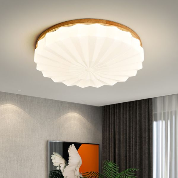 Scandinavian Solid Oak LED Flush Mount Ceiling Light with Acrylic Shade - 110V-120V 41 cm Round White Light