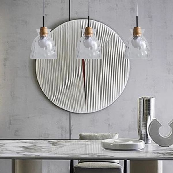 Scandinavian Wood Island Pendant Light, Hammered Glass Shade for Kitchen Island - 110V-120V Bell
