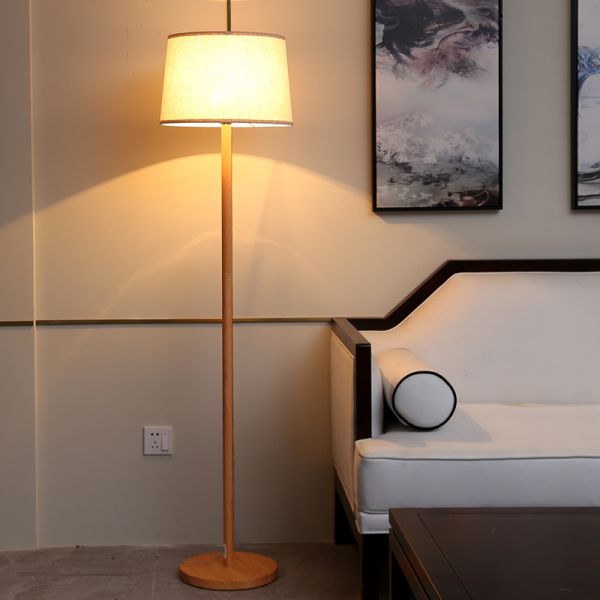 Scandinavian Wood-Look Metal Floor Lamp with Linen Drum Shade & Foot Switch - 110V-120V Natural