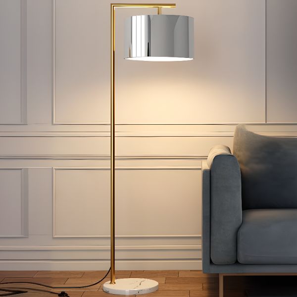 Contemporary Metal Floor Lamp with Heavy Real Marble Base & Fabric Shade - Silver Drum 110V-120V Gold