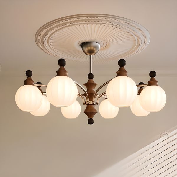 Dome Light Chandelier with White Glass Shade, 8 Lights, White Color, Direct Wired Electric, Pendant Rod Mounting, Vitreous Material, 110V-120V