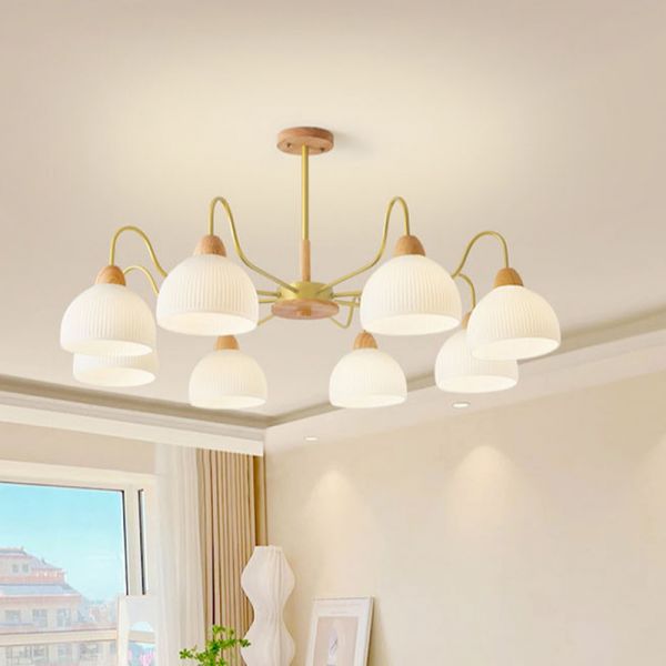 Mid-Century Tulip Chandelier, Ribbed White Glass Pendant Light for Dining & Living Room - Gold 110V-120V 8