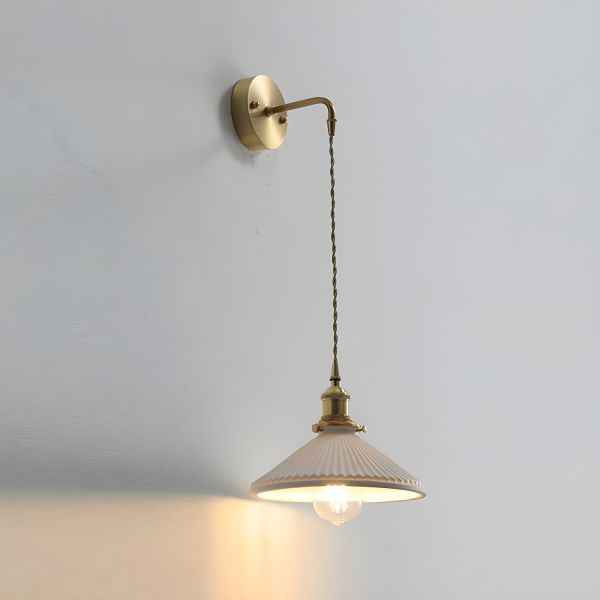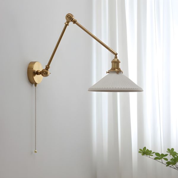 Mid-Century Walnut Wall Sconce, Brass Swing Arm Lamp with Pleated Ceramic Shade and Pull Chain - 110V-120V Cone
