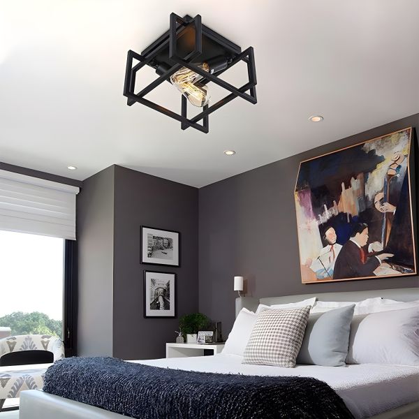 Industrial Geometric Flush Mount Light, 2-Light Black Metal Cage Ceiling Fixture, Open Frame - Black 110V-120V