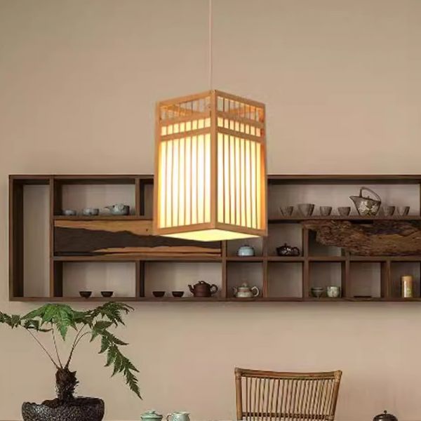 Restaurant Ceiling Hanging Lantern Wood 1-Light Japanese Style Pendant Lighting - 110V-120V Wood Color Rectangle