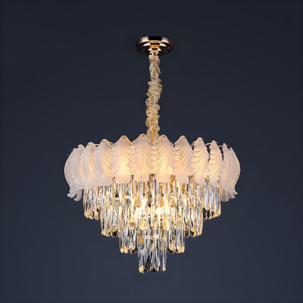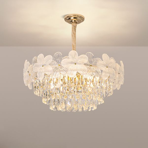 French Country Crystal Chandelier with Textured Glass Flowers and Tiered Raindrop Prisms - 8 110V-120V