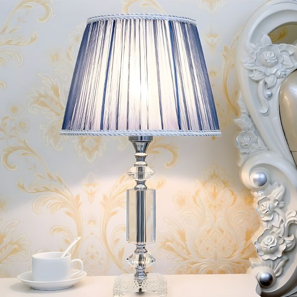Elegant K9 Crystal Table Lamp with Pleated Fabric Shade, Faceted Column Nightstand Light - 110V-120V Blue