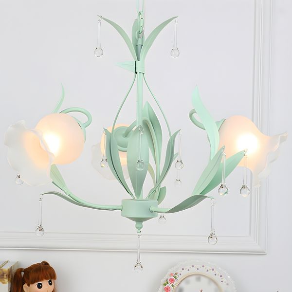 Whimsical Floral Chandelier with Crystal Drops and Frosted Flower Shades - 110V-120V Green 3 A