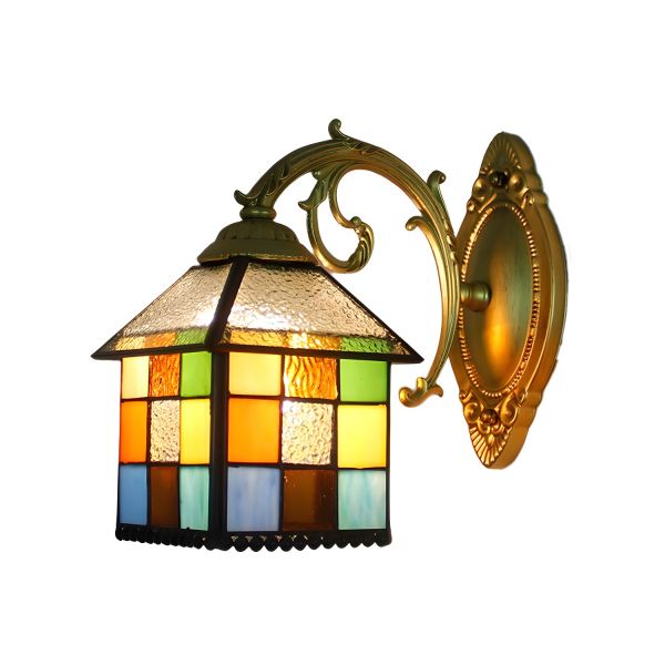 Tiffany-Style Mission Wall Sconce, Antique Brass Vanity Light with Multicolored Stained Glass Shade - 110V-120V 10.5" Geometric