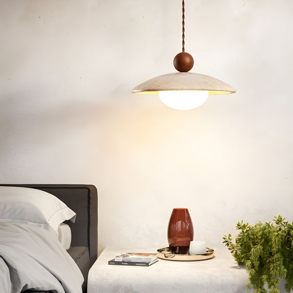 Japandi Travertine Pendant Light, Solid Wood & Natural Stone Hanging Lamp for Dining Room - 110V-120V Walnut