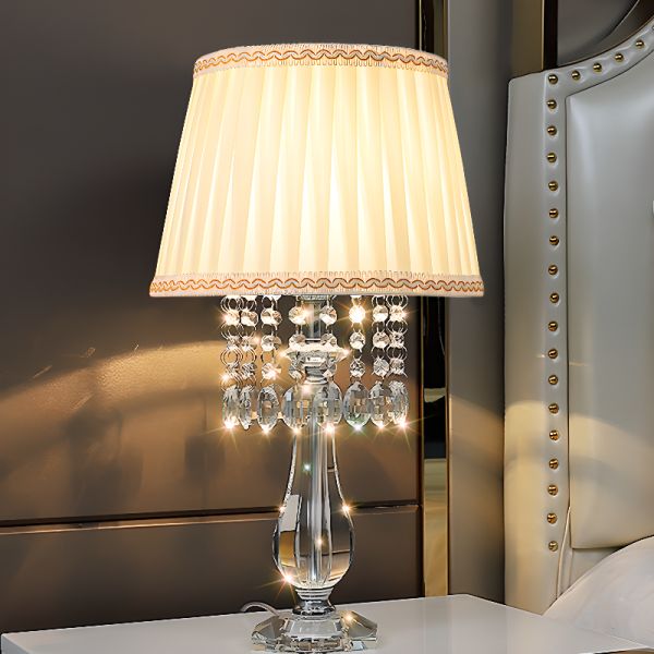 Elegant Clear Crystal Pleated Fabric Shade Table Lamp with Rocker Switch - 110V-120V Beige