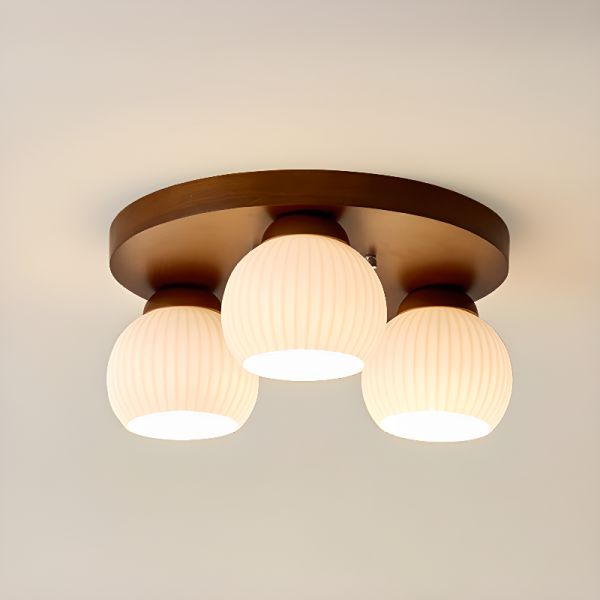 Scandinavian Solid Wood Flush Mount Light with Ribbed Glass Globes & Soft Glow - Walnut 110V-120V 16" 3