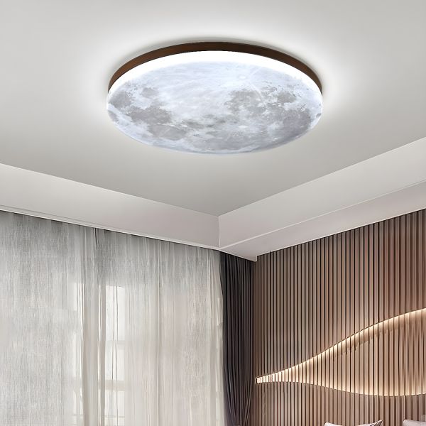 Scandinavian Wood LED Flush Mount Ceiling Light with Celestial Moon Texture Diffuser - Walnut 110V-120V 10.5" White Light