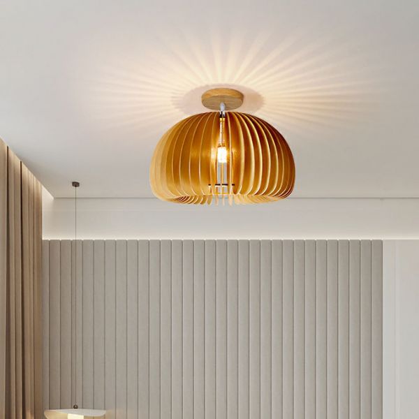 Japandi Wood Slat Flush Mount Ceiling Light, Radial Dome Fixture with Soft Ambient Glow for Entryway - Natural Finish 110V-120V 7"