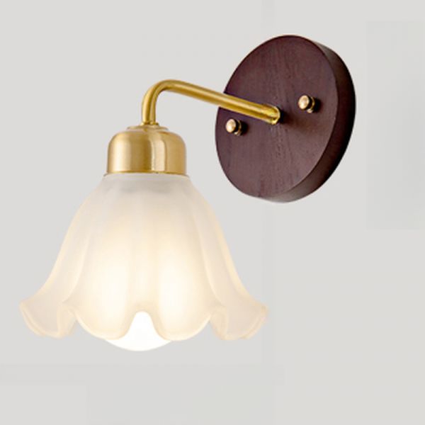 Vintage French Country Wall Sconce, Brass & Wood Vanity Light with Frosted Floral Glass Shade - 110V-120V Flower
