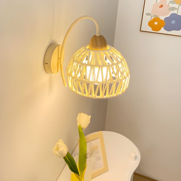 Scandi-Boho Macrame Wall Sconce, Woven Rope and Wood Bedside Lamp Fixture for Ambient Bedroom Lighting - Design 1 110V-120V