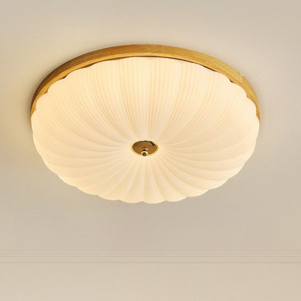Scandinavian Solid Wood Flush Mount Ceiling Light, Japandi Ribbed Glass Fixture for Hallway Bedroom - 110V-120V Wood Color