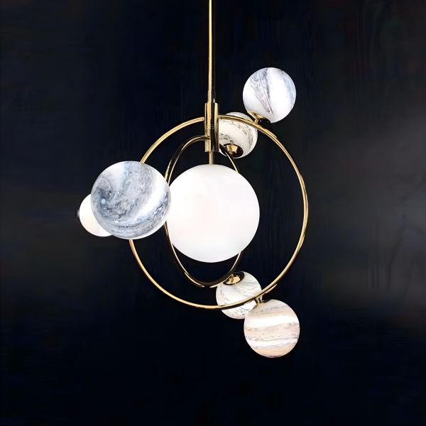 Mid-Century Modern Gold Chandelier, Celestial Orbit Pendant Light with Marble Glass Globes - 110V-120V Gold Downrods