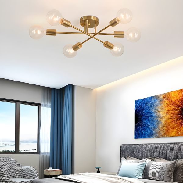 Mid-Century Sputnik Semi Flush Mount Light, 6-Light Industrial Metal Fixture for Bedroom Hallway - Brass 110V-120V