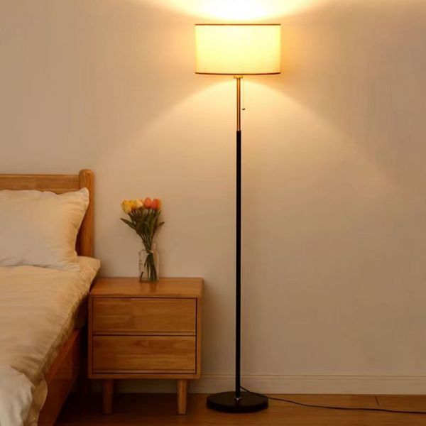 Minimalist Metal Floor Lamp with Fabric Drum Shade and Pull Chain Switch for Living Room - 110V-120V Flaxen