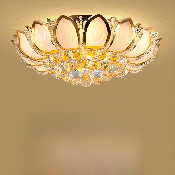 Luxury Gold Crystal Flush Mount Ceiling Light, Ornate Lotus Flower Fixture for Dining Room - 18" 110V-120V