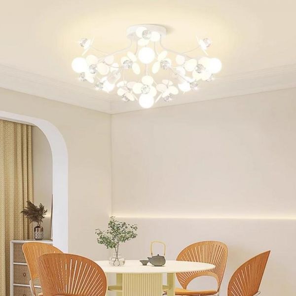 Nordic Floral Flush Mount Ceiling Light, White Branch Fixture with Acrylic Petals and Crystal Orbs - 110V-120V 24"
