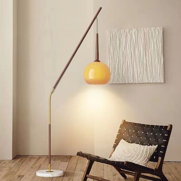 Mid-Century Arched Floor Lamp, Wood-Grain Metal with Amber Glass Globe & Marble Base - 110V-120V Walnut