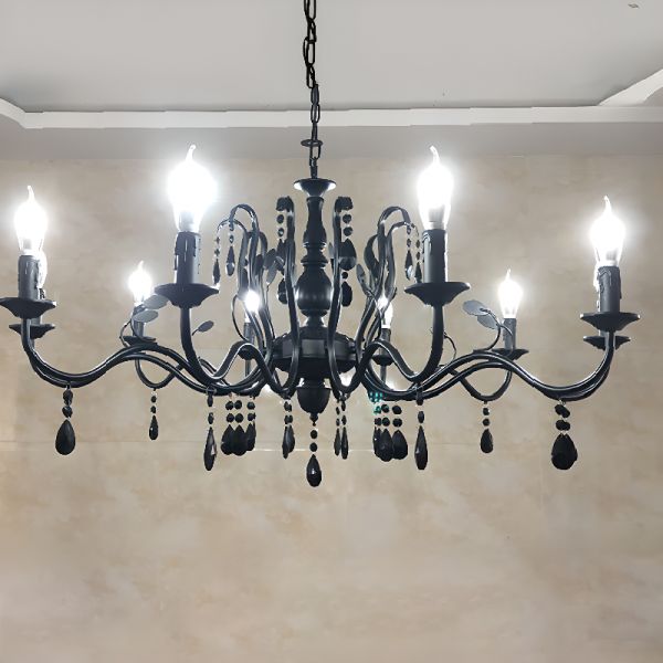 Rustic French Country Chandelier, Wrought Iron Hanging Light Fixture with Crystal Drops - Black 110V-120V Candle 10