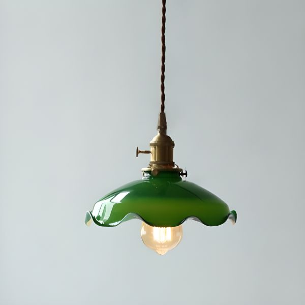 Vintage Green Glass Pendant Light, Brass Socket & Walnut Wood Accent, Scalloped Hanging Fixture - Gold 110V-120V